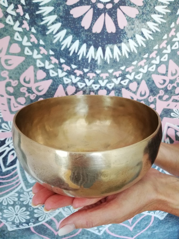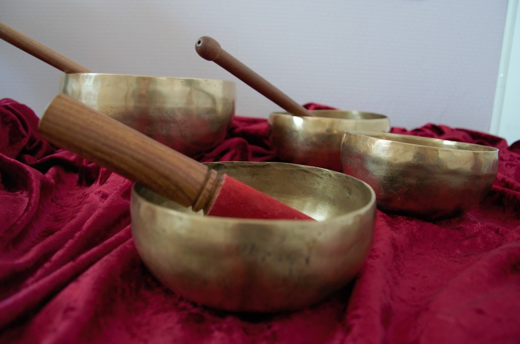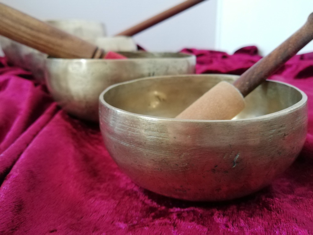 Die Klangschalen werden auf den bekleideten Körper gestellt und sanft angeschlagen.